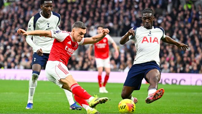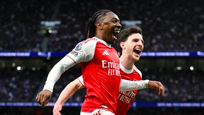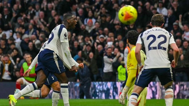 第61分钟,热刺防线一片混乱,萨卡的单刀射门被挡出,皮球来到埃泽的脚下,埃泽梅开二度,两回合对阵热刺打进5球,效率极高。